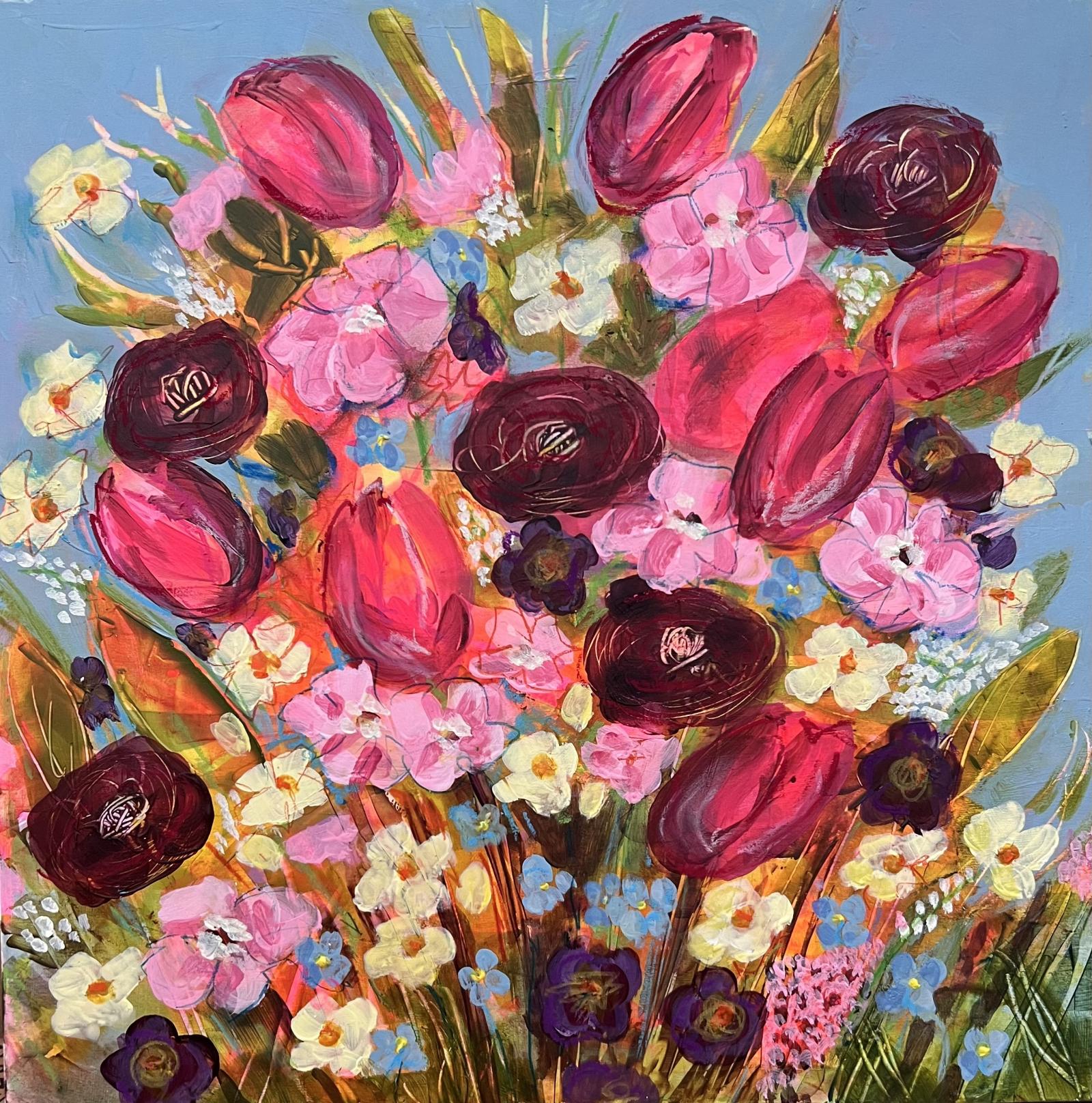 A joyfull little painting of a spring vase of flowers featuring Ranuncula and Tulips.